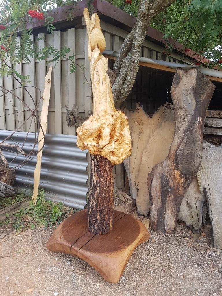 Aus einer Birke mit einer Maserknolle entstand diese Skulptur während der Sommerakademie 2025. Sie steht auf einem massiven Eichensockel.