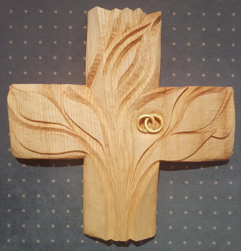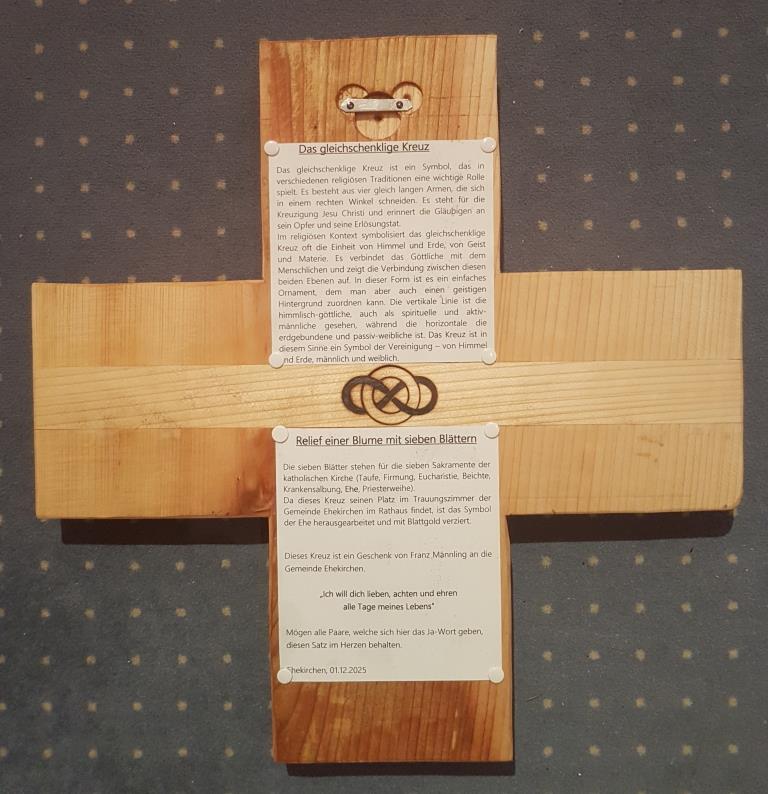 Da dieses Kreuz seinen Platz im Trauungszimmer der Gemeinde Ehekirchen im Rathaus findet, ist das Symbol der Ehe herausgearbeitet und mit Blattgold verziert.